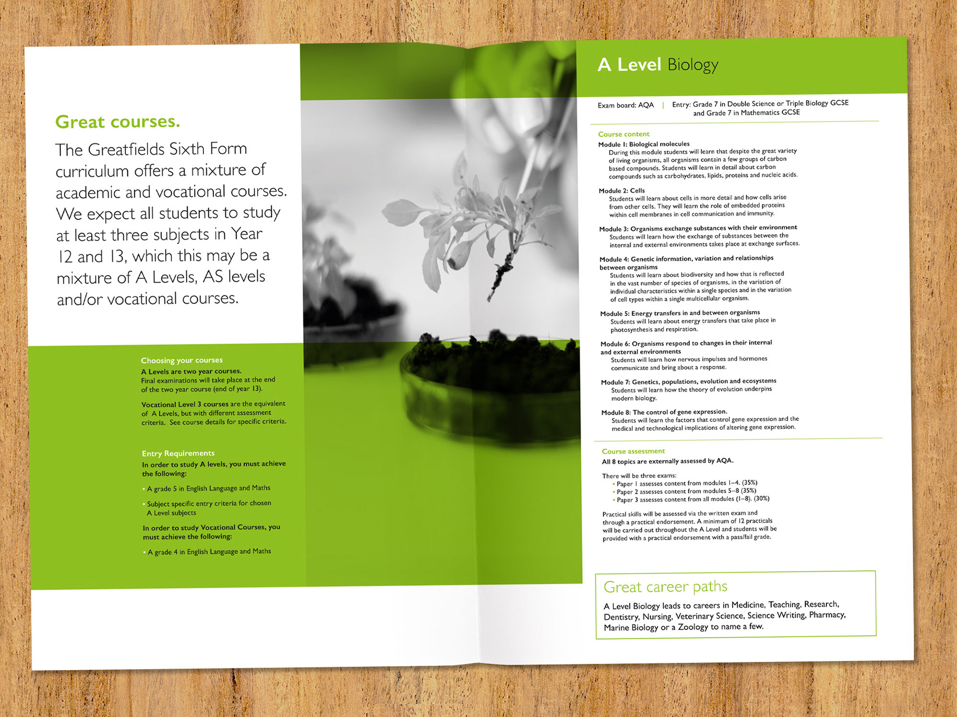 After the success of the main prospectus for Greatfields school and due an expansion of their offering I was asked to create a prospectus for their shiny new 6th form. What an absolute pleasure to be working with them again.