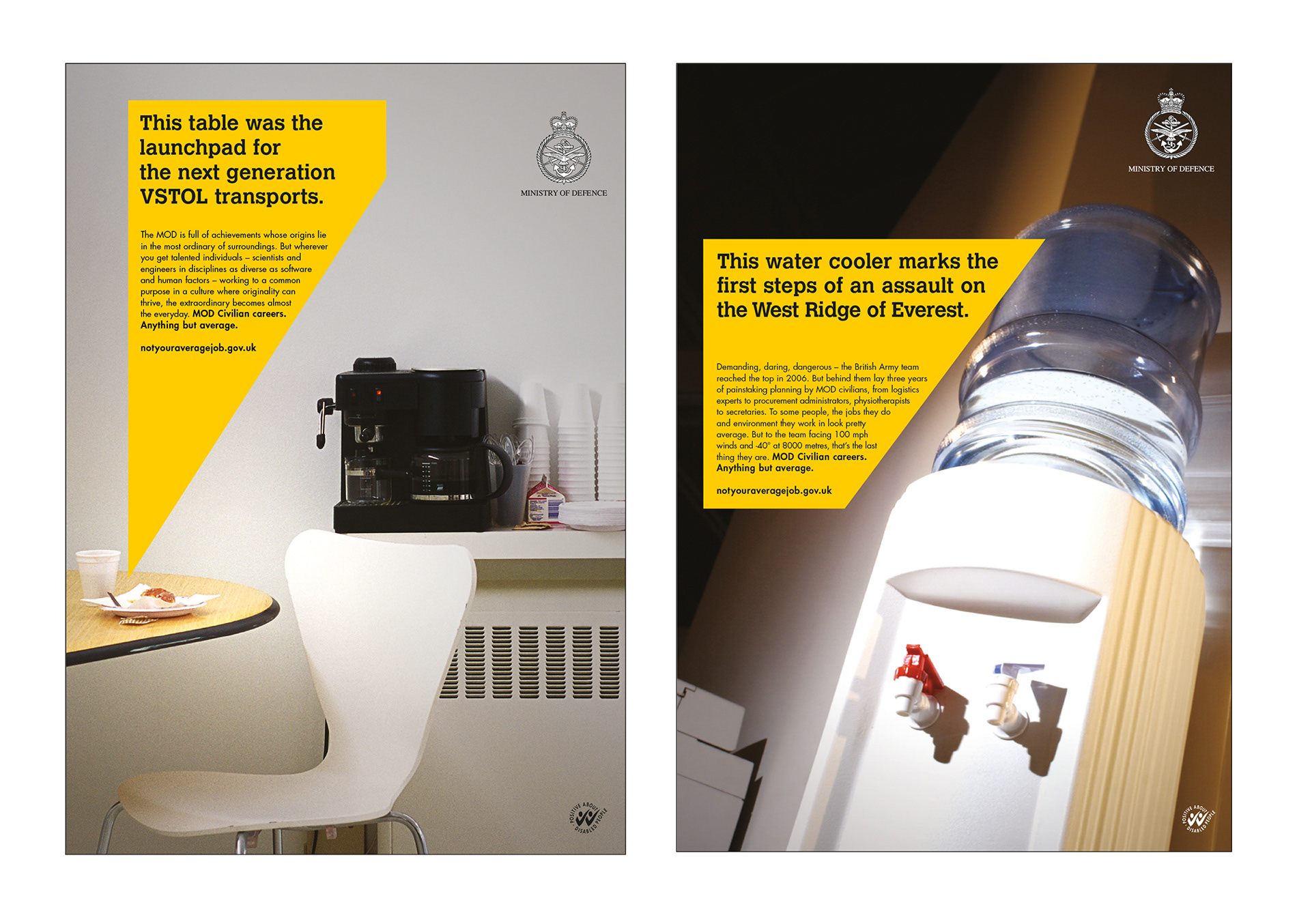 During my time at Advertising Agency, Barkers, I worked on numerous MoD campaigns, ads and pitches. This one was my favourite. Working as the Art Director in part of a team with an amazing copywriter, we created the following campaign. This was for a pitch aimed at Civilian Careers and the importance that they have within the MoD, so you could say that the work of civilians in MoD has come closer to that of the services they support.